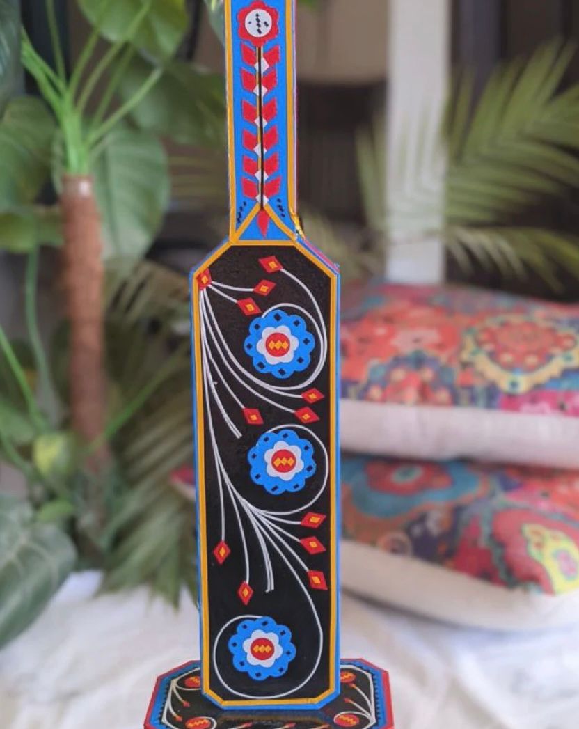 Add a touch of artistry to your space with our Black Decorative Bat. This stunning piece merges the worlds of cricket and music, drawing inspiration from traditional motifs to create a truly unique decor item. With its vibrant hand-painted design featuring intricate patterns in blue, red, and yellow, this bat is more than just a decorative item—it's a statement piece.
