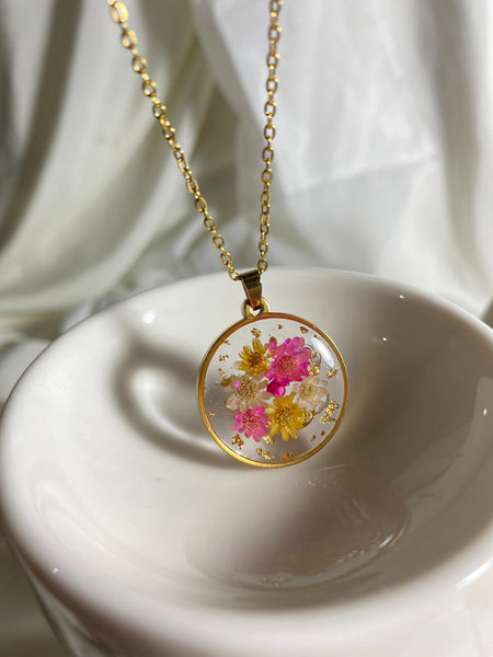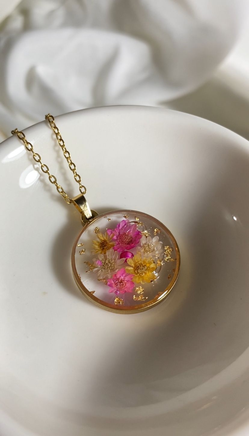 Introducing our exquisite Floral Pendant! Handcrafted using real flowers and encapsulated in mesmerizing resin art, this stunning piece of jewelry will add a touch of natural beauty to any outfit. Perfect for nature lovers!