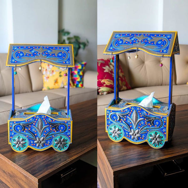 The Blue Tissue Cart's unique design adds a touch of sophistication and charm to any space. Its vibrant blue color and intricate detailing make it a standout piece that not only serves a practical purpose but also enhances the aesthetic appeal of your surroundings. The cart is ideal for organizing your tissues in a trendy and convenient way, keeping them easily accessible while also adding to your decor.