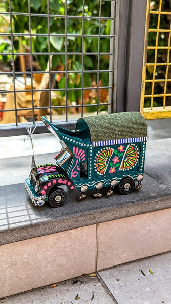 Introducing our green hand painted truck, meticulously crafted as a stunning piece of truck art decor. With its intricate design, this 1lb masterpiece measures 9 inches in length, 6.5 inches in height, and 3.2 inches in width.