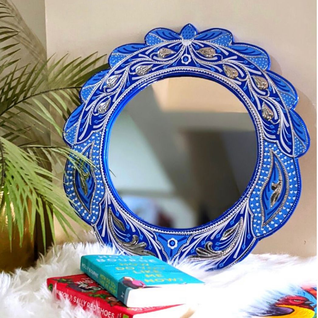 Introducing our stunning Blue Colorful Chamakpatti Mirror! Handcrafted with intricate detailing and vibrant blue hues, this mirror effortlessly adds a pop of color and elegance to any space. A true masterpiece of artistry.